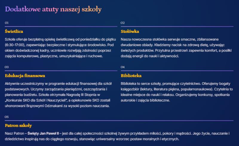 Szkoła osiąga wysokie wyniki egzaminu ósmoklasisty, a uczniowie odnoszą liczne sukcesy w konkursach i zawodach sportowych. Nad bezpieczeństwem i wszechstronnym wsparciem dzieci czuwa zespół specjalistów: psycholog, pedagog, logopeda oraz pielęgniarka. W placówce działa również Szkolne Centrum Mediacji, wspierające uczniów w rozwiązywaniu konfliktów rówieśniczych.